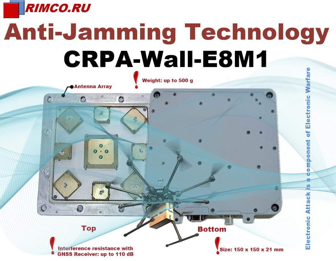 RIMCO’s Wall-E2 (weight 100 g) the ultraLight CRPA satellite navigation anti-jamming antenna, a next-generation, ultra-lightweight solution designed for UAVs, robotics, and mobile applications where every gram matters.